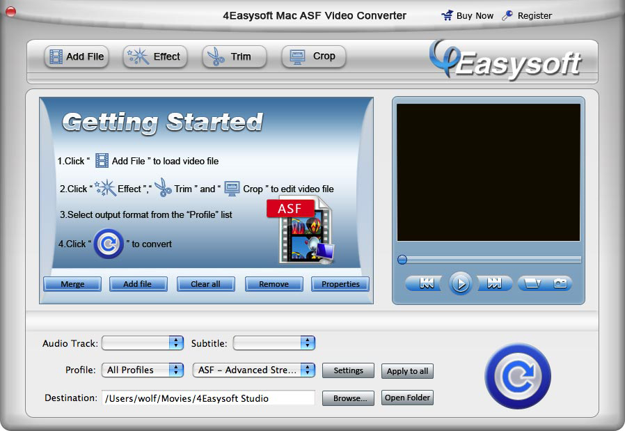 4Easysoft Mac ASF Video Converter is a world-class ASF Video Converter for Mac application. It provides an easy and completed way to convert video formats such as AVI, MPEG, MP4, WMV, MOV, VOB and HD TS, QuickTime HD MOV, HD RM etc to ASF, like convert AVI to ASF Mac with the perfect output quality. What’s more, ASF Video Converter Mac is an audio extractor or converter for you to obtain MP3, MP2, WMA.Besides, 4Easysoft Mac ASF Video Converter can recreate video and audio to meet your needs such as effect, trim, crop, merge, preview, set output parameters and snapshot.