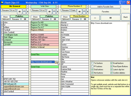FlashClips is the U3 portable version of the M8 Multi Clipboard. Anything that can be cut or copied to the Windows clipboard can be captured and stored by FlashClips on your U3 smart drive ready to paste back on any PC you plug it into – and - FlashClips doesnt stop at just pasting. If a clip is a web address, it can launch a browser and load the page, if a clip is and email address, it can start an email and if it’s a phone number it can dial it.