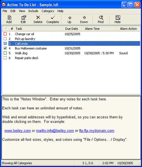 To-Do List organizer tracks your tasks in an easy to use format. Quickly record as many notes as you need for each task, and organize your tasks into categories or even different to-do lists. Tasks can be set to repeat at a wide variety of intervals so repeating tasks only need to be entered once. Remind yourself with a variety of alarm options including a popup window, playing a sound, sending an email reminder, or running any program. Your to-do list can be published to your web site with the push of a button, so you can view it even while you're away from your computer. Active To-Do List is very simple to learn and use, but also offers advanced filtering and searching capabilities when needed.