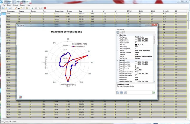 AerscreenEZ is a Windows-based graphical user interface (GUI) for the US-EPA AERSCREEN air quality model, which estimates the worst-case impact of ground level concentrations for a single source. AerscreenEZ is very simple to use and facilitates the insertion of the input variables, automatically launches all the needed programs and creates charts. AerscreenEZ allows to simulate different types of sources (vertical stacks capped and uncapped, horizontal stacks, flares, area sources, etc.). It may simulate the building downwash effect and the effects of complex terrain.