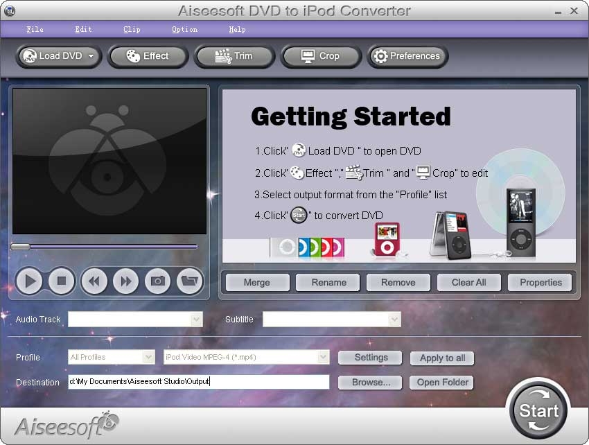 Aiseesoft DVD to iPad Converter is the best and most powerful DVD to iPad converter, which allows you to rip any DVD file to nearly all popular video formats like AVI, MPEG, WMV, DivX, RM, MOV, 3GP, 3GP2, MP4, etc. Also this magic software enables you to extract most audio formats, such as MP3, WAV, WMA, AAC, AC3, M4A(AAC), OGG, RA, AU, etc, from DVD file. In order to have better playing effect for you, Aiseesoft DVD to iPad Converter provides you with powerful editing functions. It allows you to trim, crop and watermark your video. Moreover, you can adjust the video brightness, contrast and saturation. You can even merge several DVD pieces together and output them to a single file. Now download our product and have a try. Key Features 1.Adjust video effect Aiseesoft DVD to iPad Converter allows you to adjust video brightness, contrast and saturation for you to get customized video effect. 2.Deinterlacing You can convert an interlaced DVD to a progressive one through the function of “D
