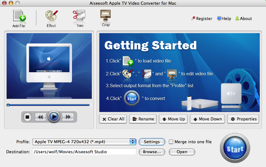 The best Apple TV video converter for Mac enables user to adjust output video effect, trim your loved video segments, crop the video to remove the black edges and choose the play region you want. It also provides more parameters like bitrate, frame rate, resolution and audio channels to set for conversion. With Aiseesoft Apple TV Video Converter for Mac you can enjoy your HDTV on Apple TV anytime you want.