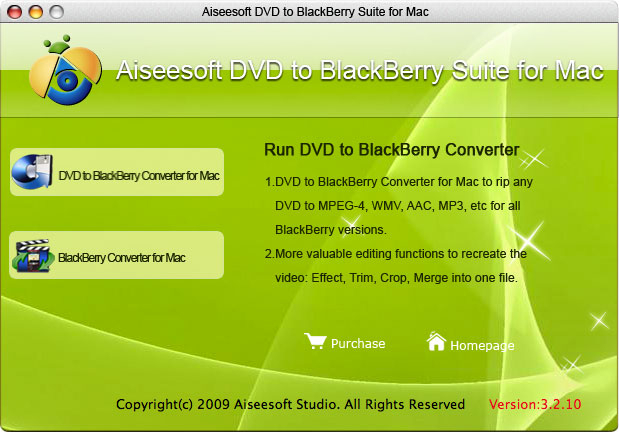 Aiseesoft DVD to BlackBerry Suite for Mac consists of Aiseesoft DVD to BlackBerry Converter for Mac and Aiseesoft BlackBerry Video Converter for Mac.