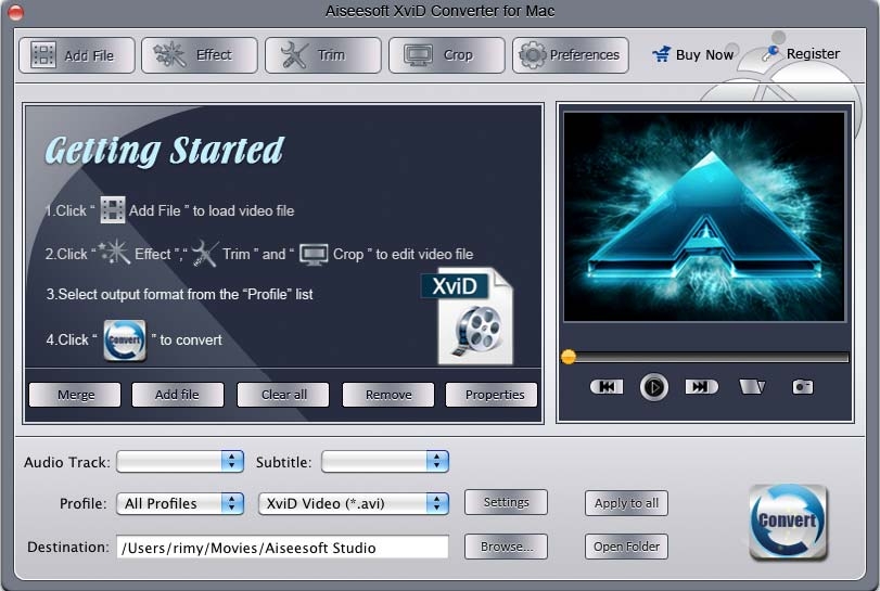 Aiseesoft XviD Converter for Mac is the professional Mac XviD Converter to convert any video to XviD, DivX, such as convert 3GP to XviD, convert MP4 to XviD Mac. The supported input formats includes: MPG, MPEG, MPEG 2, VOB, DAT, MP4, M4V, TS, RM, RMVB, WMV, ASF, MKV, AVI, 3GP, 3G2, FLV, SWF, MOD, TOD and HD video.