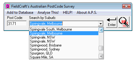 Boost advertising effectiveness using the Australian Postcode Survey to determine the impact of your advertising dollar. Data entry using the Australian Postcode Survey is fast and the application occupies only a tiny part of the screen so that you can get on with your business while the Australian Postcode Survey awaits your next entry. The Australian Postcode Survey even automatically assigns a postcode when a suburb is picked from the list so customers need not know their own postcode to be easily included in the analysis of your regional marketing effectiveness.