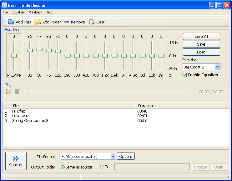 Boost bass or treble frequencies, cut bass or treble frequencies, convert to lossless audio formats FLAC, Wav or Mp3.