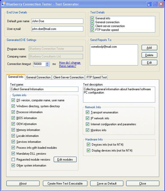 The modern PC environment is extremely flexible and because of this virtually every home, office or factory now has one. However this flexibility can sometimes create difficulties when writing software to run on a variety of PC configurations, or when attempting to diagnose problems remotely. Remote diagnosis is made even more difficult when the user is inexperienced or when problems are intermittent. The Blueberry Connection Tester is a free customizable test tool which allows consultants and software developers to efficiently gather information from remote PCs - and it's free to download and use.