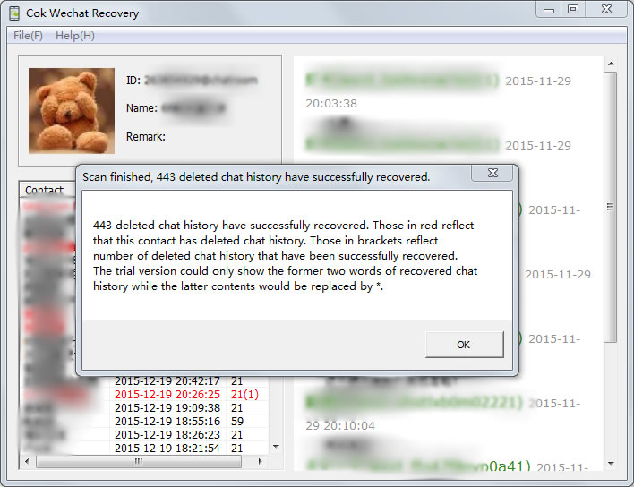 Wechat chat history of iPhone and Android phones is encrypted and saved in mobile phone. Now we can used Cok Wechat Recovery to export all Wechat messages from mobile phone to computer for viewing. It can not only decrypt all Wechat data (including text messages, images, voice messages and sight) for iPhone and Android phones, but also it can recover deleted Wechat messages for iPhone and iPad (all iOS system). Even if the contacts are deleted ( in blacklist), the messages can be recovered properly.