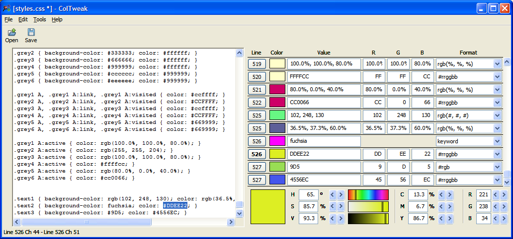 ColTweak is a CSS (Cascading Style Sheet) color editor. It is a tool designed for web designers' convenience. Rather than having to hunt for each color defined within a CSS file, a designer can view all the colors at once and edit them in one place. The color profile for a web site's design can be adjusted and tweaked much more easily with ColTweak. Every professional needs dependable, quality tools in order to effectively perform his or her job. ColTweak will soon become an essential tool in professional web designers' toolboxes.