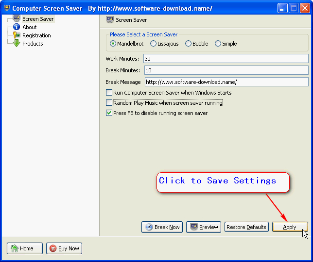 'computer screensaver' includes 5 screensavers. 'computer screensaver' is compiled of the customizable features that can be configured to set the work time, break time and even set your favorite music to be played. Press F8 to disable a running screensaver.