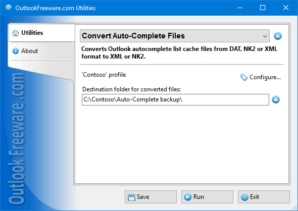 Free tool for saving Outlook contacts to NK2 or XML autocomplete list cache files. These files are useful for editing, backing up or transferring auto-complete lists to another com ...