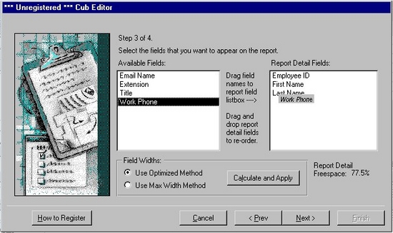Inserting a field into a report with Cub Editor is a simple matter of dragging and dropping a field name from one list box to another. Cub Editor adds the appropriate controls to the report header, detail, and footer sections and then evenly spreads report controls horizontally across the report. So, you no longer have to make never-ending adjustments to “straighten out” report fields.