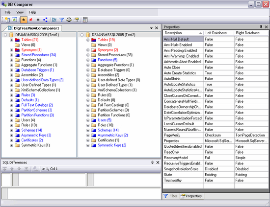 DBComparer is a professional database tool for comparing Microsoft SQL Server 2008 (and 2005) database structure. It is an excellent tool for any project development team or DBA's managing multiple copies of the same database on SQL Server. It's uniquely build user interface will bring you the best visual representation of differences and will give you the best way of discovering and eliminating differences.