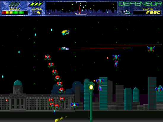 Defensor is a superior quality, horizontally-scrolling, shoot-them-up game for the PC. Defend the planetoid against alien invasion. Protect the humanoids from abduction and more. Destroy the waves of multiple alien bug types, all with individual characteristics, collect bonuses and power-ups, and prepare to battle the mother alien.