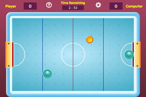 Beat your rival with swift style in this exciting air hockey game! Your goal is to shoot the puck into the computer's goal, and at the same time prevent it from doing so. When the game opens, you will be given a table with two goals, with the one on the left as your goal and the right one belongs to the computer. Two mallets are placed in front of the goals, and the puck is placed at the middle of the table. When you are ready, click the Yes button to begin the 3-minute game. Click and hold your mallet on the left of the table, then move it to shoot the puck. Neither side should cross the red line at the middle of the table. The goal area of each side will be indicated by a flashing red light, so remember to defend it or the computer will score. Whenever a goal is shot, the scoring side will receive 1 point, and you will be asked to get ready again. Click the Yes button to continue the game. Strike to achieve an ultimate triumph!