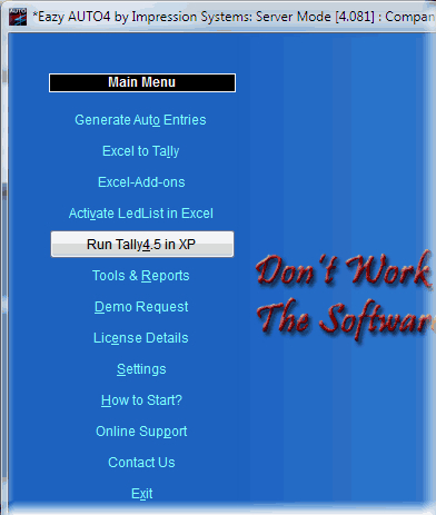 Eazy AUTO4.0 provides a simple and easiest automated way to post your data from Excel to Tally. This utility is developed by Impression Systems. Eazy AUTO4.0 also generates automatic fixed or randome entries to be posted in Tally. Now you can run Tally4.5 in Windows Xp , Vista or even in Windows7 using AUTO4.0 without using virtual machine.