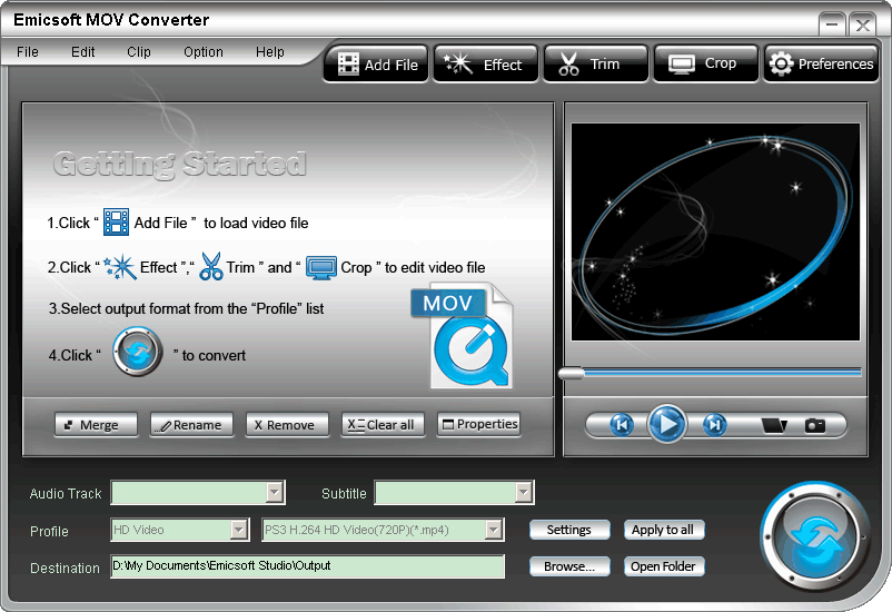 You also can edit movies with powerful edit functions, adjust video brightness, contrast and saturation, trim video into segments, merge files, etc. Just have a free download of the Emicsoft MOV Converter.