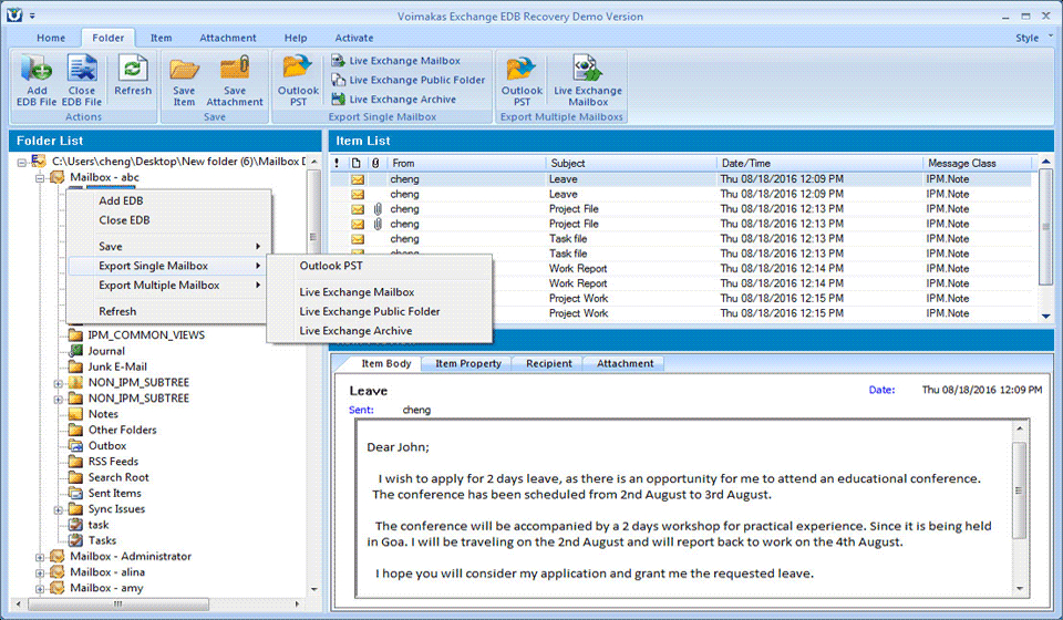 Are you looking tools to recover EDB Mailbox to PST format? Using Exchange Server EDB Mailbox Recovery software to perform complete EDB Mailbox Recovery process then export entire EDB mailbox to Outlook PST file format. It also export selected emails items from EDB files to Outlook EML or MSG file format. Exchange EDB Mailbox Repair tools have an advance features that helps you to repair highly corrupted EDB files and directly export into Live Exchange and Office 365.