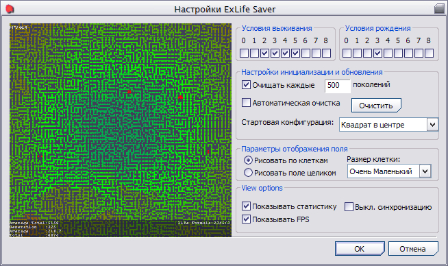 Screensaver based on Conway's Game of Life. Customizable life rules (survive and born rules). Every cell colored by its age. Two drawing mode: separately draw every cell and draw whole field with average color for 4 neighbours points.