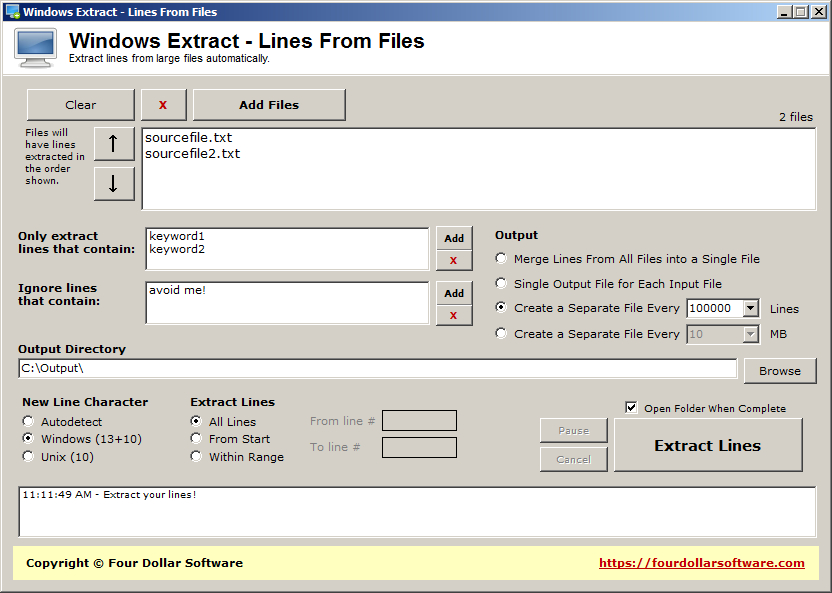 With multiple output options, Windows Extract can automatically create separate files each time a given number of lines has been extracted, or when a given file size has been reached. You can also extract all lines to a single file.