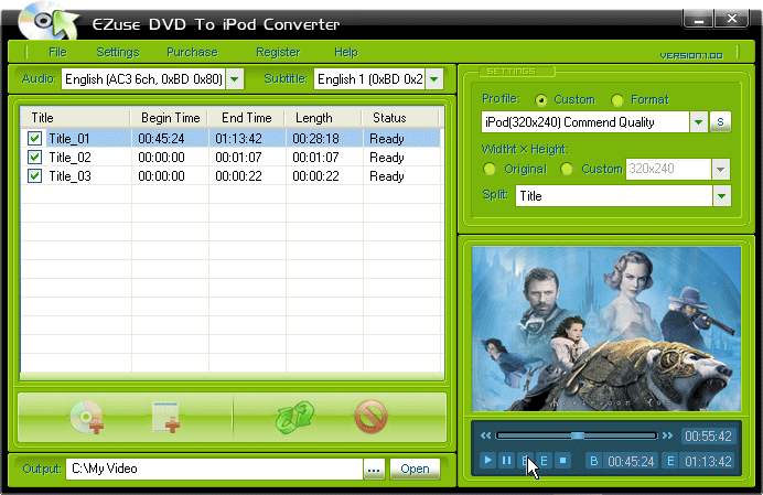 EZuse DVD to iPod converter is the new generation of DVD to iPod Converter software, While the image quality is high, the conversion speed is very fast (up to 600%). With Ezuse DVD To iPod Can helps you Convert DVD to iPod Video format and convert dvd to iPod audio format. If you want to convert only the outstanding part of the DVD, you can preview it with the built-in player and then set up a start time and end time. Then EZuse DVD to iPod Converter will convert only the customized part not the entire video. With EZsue DVD To iPod Converter's cute and easy-to-use interface, you will have a good mood when you are at work. You can quickly master it without any previous study. Download and try it now, the best choice you’ve ever had.