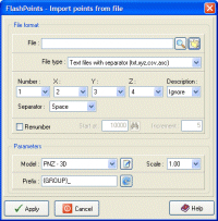 FlashPoints is a tool for creating and managing points Groups (topographic points for example). FlashPoints allows you to : * import/export points coordinates from and to a file * create points and their attributes 'Number', 'Elevation' and 'Description' by clicking * modify the points elevation * modify the height and rotation of the attributes * create points on existing entities * create the table of the coordinates * .... Points are organized as groups to allow an easy differentiation of them. FlashPoints comes with a 'Points Number input box' that lets you respond to AutoCAD commands with a point Number or a sequence of points Numbers rather than with a click or coordinates