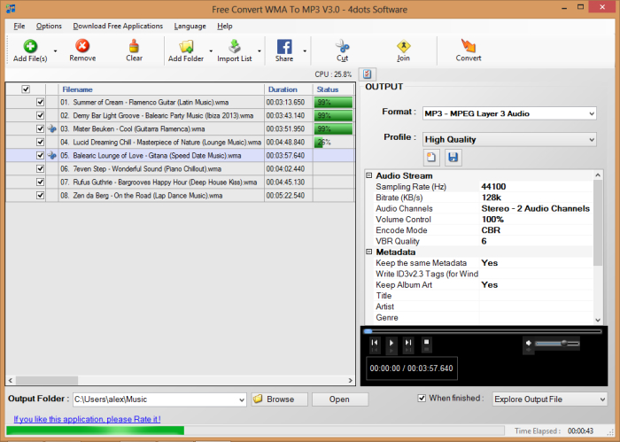 Free Convert WMA To MP3 is very to use. Simply add the WMA files to convert, select the target audio format and quality profile and then press the "Convert" button.