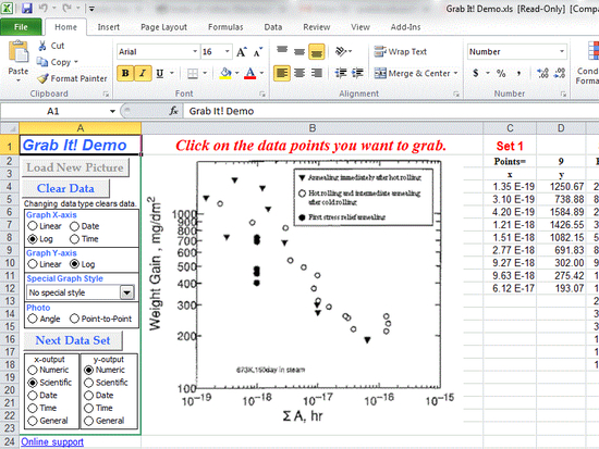 Grab It! is a Microsoft Excel based application that digitizes data from pictures. Graphs and charts can have data point values digitized or have angle and distance measurements made on scanned photos. Skewed graphs are handled automatically (sometimes scanning isn't perfectly straight) as well as linear, log, date or time charts. Output is displayed in real time and special features for error bar graphs, stock charts, and multiple data sets are included. This is especially useful for accurately digitizing published data in open literature for comparison against your own data or improving accuracy when digitizing old data that isn't in an electronic format (old hardcopies of charts for instance). Free Demo.