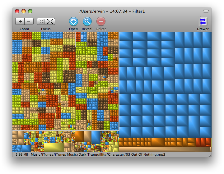 GrandPerspective is a small utility application for Mac OS X that graphically shows the disk usage within a file system. It can help you to manage your disk, as you can easily spot which files and folders take up the most space. It uses a so called tree map for visualisation. Each file is shown as a rectangle with an area proportional to the file's size. Files in the same folder appear together, but their placement is otherwise arbitrary.