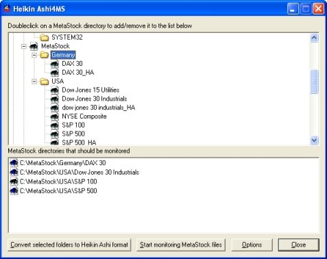 The directory with the original data files will not be modified. The program creates a new directory containing all the securities of the original directory and modifies the open, high, low and close values. As soon as you add new records to the original data directory Heikin Ashi4MetaStock will recognize the changes and will automatically update the data files in directory containing the Heikin Ashi values.