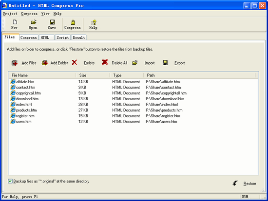 HTML Compress Pro is a software tool to compress web pages. It reduces the size of web pages but keep the same appearance when opening in web browsers. Your web pages will load faster after compressed, it saves the bandwidth and disk space of your web host.