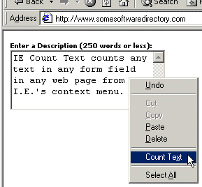 Adds new Count Text context menu item to Internet Explorer. Right click inside of any form field on any page loaded in IE and click the new menu item. The amount of lines, words, and characters in that field is then quickly counted and displayed. Great for software authors or webmasters who regularly submit files or sites to directories that limit the amount of words or characters typed into the description field on their forms. Completely safe to use, does not alter IE program file or hinder its performance in any way.