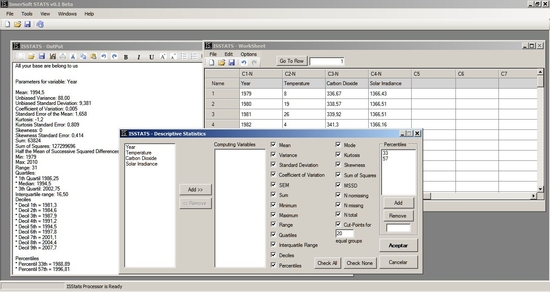 InnerSoft STATS is a Descriptive Statistics Application. InnerSoft STATS compute statistics for parameter estimation and Statistical hypothesis testing. Descriptive Statistics: Mean, Variance, Standard deviation, Coefficient of variation, Quartiles, Percentiles, Skewness, Kurtosis, Mode, Interquartile range, Sum of Squares. One-Sample Test: One-sample z-test, One-sample t-test, Chi-squared test for variance.Two-Sample Test: Student's t-test for Independent samples (pooled t-test for equal variances and unpooled t-test for unequal variances), Student's t-test for Paired samples, Two-sample F-test of equality of variances.One-Way ANOVA with multiple comparisons methods: Scheffe, Tukey HSD, Sidak, Fisher LSD, Bonferroni. Welchs Test for equality of means, BrownForsythe Test for equality of means. Homoscedasticity Test: Levene's Test, BrownForsythe Test for equality of variances, Bartlett's Test. Bivariate Correlation Tests: Matrix of covariances, Pearson Product-Moment Correlation Coeffic