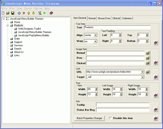 JavaScript-producing design tool for creating menu system on web pages. The menu script can be customized highly and easily through the SCP(Script Configuration Program). You can specify caption, font, color, link and more to script. It is unnecessary to write any code manually. SCP will generate all necessary codes automatically. You need to upload some files to web server to get the menu to work and all these files will be saved along with the project file so that you can easily find and publish them to the Internet or deploy to Intranet. Help documentation is included but you may not need it with this easy-to-use tool. With this easy-to-use script authoring tool, you can make a professional menu just in minutes!