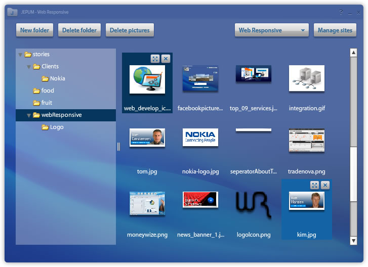 This effecient little application will increase your productivity when managing your pictures and folders in the Joomla Media Manager backoffice. By using this application, you don't have to log in to the backoffice, go to the media manager, find the folders to upload to, etc. every time you need to upload pictures. You just start this application, select your Joomla site you want to upload pictures to and start dragging the pictures into the folder on your Joomla site. It provides the following core functionality: Easy drag-n-drop of pictures from your desktop to the application Uploads automatically directly to your media folder on your Joomla site Fast overview of picture folders and their images Create and delete picture folders to improve your media manager organization Easy viewing of pictures in larger format Easily swap between several Joomla sites Simple configuration of multiple Joomla sites Automatic log in to your Joomla site FTP installation of Joomla Picture Manager co