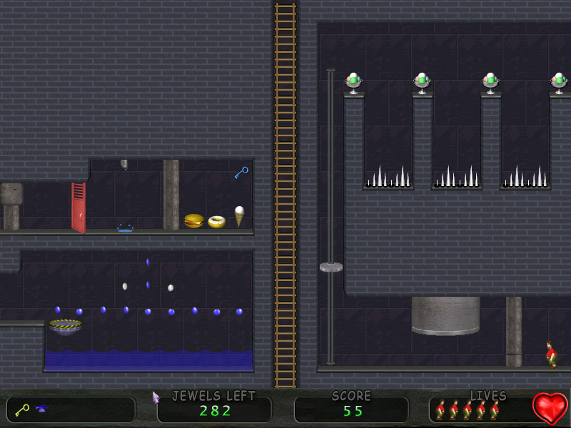 Leaping Freddy is a new platform game where you meet a little kid, Freddy who decided to skip boring lessons and look for something more challenging. Driven by his irresistible curiosity, Freddy sneaks into the castle of a local wizard. So, your objective is to guide him through a maze of rooms, collect all gems and find the exit. Your journey won’t be all milk and honey as to get into a new room you’ll have to find the key that matches the door in color. Since the key may be a couple of rooms away, you’ll have to do a lot of walkabout, including climbing ladders, ropes, riding elevators and jumping from one moving platform to another. Along with keys, you’ll have to pick up all treasure gems and food as it restores his life vitality. Always watch where you go as the house is equipped with an advanced security system against curious intrudes like your Freddy. To save his lives, you’d better stay away from tricky traps, jump over acid puddles, run fast under big drop hammers and be care