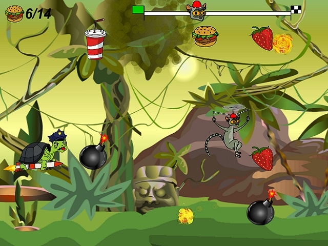 Lemurzin is a unique crazy runner game. Play for mad Lemurzin and collect hamburgers, cola, ice cream and french fries. Dodge the dangerous obstacles and bullets. And remember police turtle always will pursue you, turtle which is flying on a rocket with a deadly weapon.