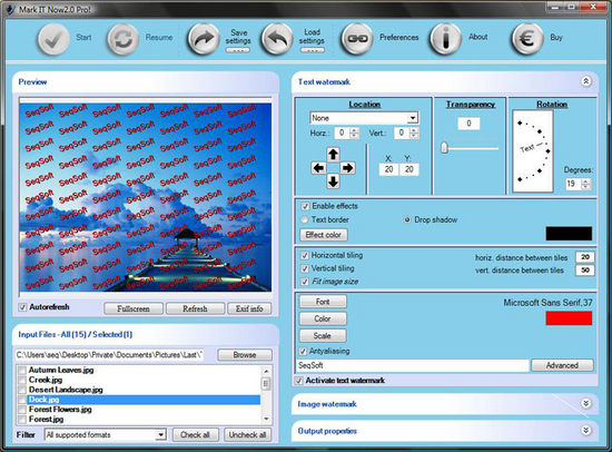 Mark IT Now! is an easy to use visible watermarking software. With only a few clicks you can protect all of your digital images by putting copyright text or graphic watermarks on them. You can customize image and text watermarks by changing their transparency, rotation, tiling, fonts, automaticly font sizing to fit image size and many other. You may also use metadata such as filename, photograph creation date, etc as text watermarks. You can save several settings patterns and then simply load one of them in a later time. Mark IT Now! includes also features like output resizing, creating thumbnails, and changing output image format.
