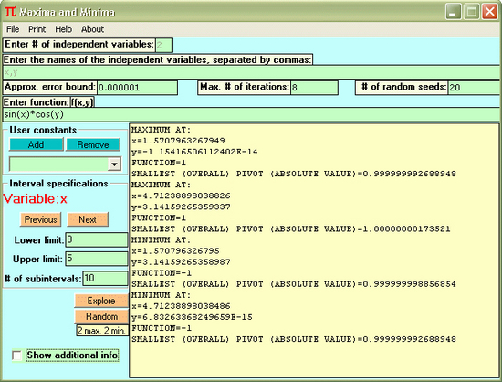 Finds the relative maxima and minima of multivariable functions in a given interval. It can fully explore defined intervals to search for multiple solutions or quickly find solutions starting with random seeds. You may predefine constants and specify the error bound for the results. Handles a wide variety of functions, including trigonometric and hyperbolic functions. Results can be saved or printed. Includes a help file with instructions, example and methodology.