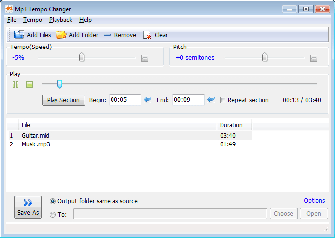Mp3 Tempo Changer is a player & converter, which can change tempo and pitch respectively,speed up or slow down of mp3 mp2 mp1 ogg wma ape flac wav midi files.