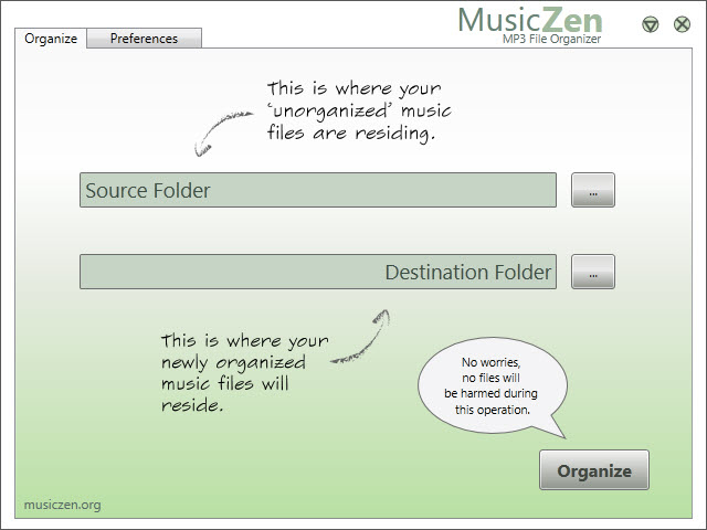 To get started, you simply specify the source and destination folders and click ‘Organize’. MusicZen will then search for any .mp3 files under your source folder (including sub-directories) and move or copy the files to the destination folder. Along the way, it will rename the files and build the directory structure of your choice. If the files you are trying to move have duplicates, MusicZen will transfer only one copy of the file to the destination folder and leave the duplicate in the source folder. At the end of the run, it will let you know how many duplicates it found.