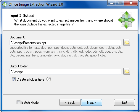 With this easy to use program you can extract all images from office documents and save them as separate picture files. Process one file at a time or many at once using the batch extract mode. The following document types are supported: