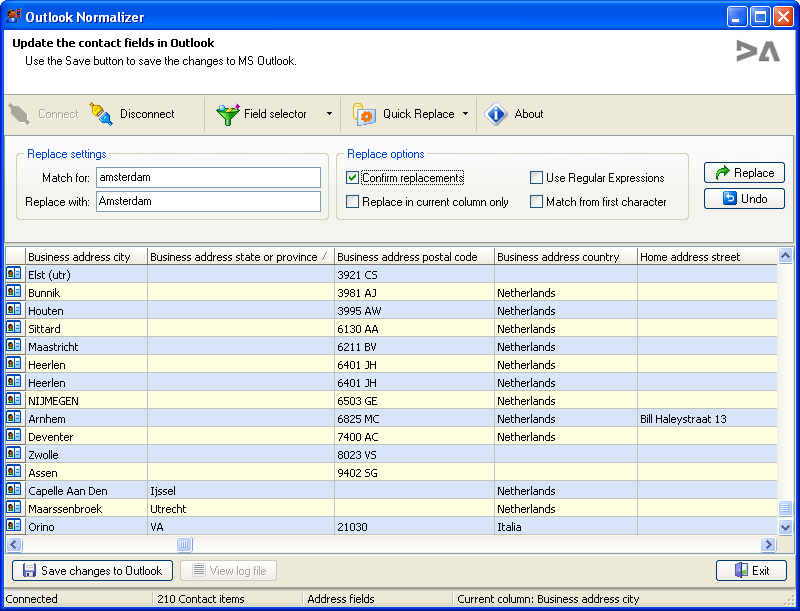 Outlook Normalizer is a simple stand alone program for Search and Replace in your MS Outlook contact data. The straight forward interface will assist you in renaming and formatting names, addresses, phone numbers, area codes, etc for multiple contacts at once.