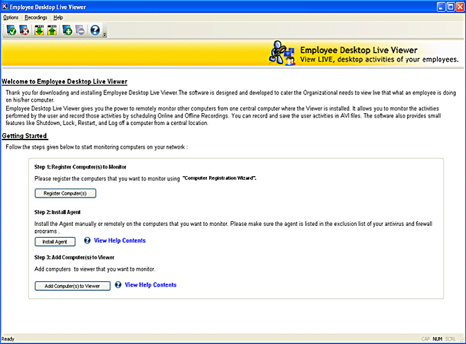 PC activity monitor displays activities of all selected computers and allows the user to record and save them. With it, the user can continue monitoring employee desktop activities even when he or she is not present. This is possible through the option of offline recording. All activities recorded offline are saved as various image files at the defined location on target computer. The user can easily import the offline recording folder from target computer and create AVI file with imported offline recording images. Managing all registered computers remotely is also very easy with available admin tools. To make all users familiar with features and functions of PC activity monitor before making ac