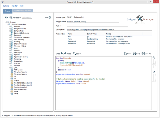 Snippet Creator - change existing snippets, create new snippets, advanced placeholder functions for PowerGUI (auto-creation of placeholders, delete existing placeholders with auto-replacement to the default value, auto highlighting of placeholders etc.)