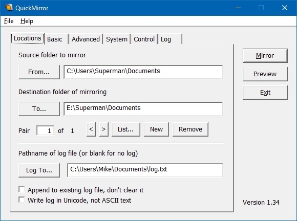 QuickMirror is a Windows file management utility that quickly transforms destination folders into mirror images of source folders. Variations of mirroring are allowed through basic and advanced options. All mirroring actions can be saved into a log for future review. A preview command enables testing mirroring options on the source and destination folders, and when used with logging, provides a way to see the results of mirroring beforehand. QuickMirror can be used for many purposes, such as quick updating of backups, synchronization and mirroring.