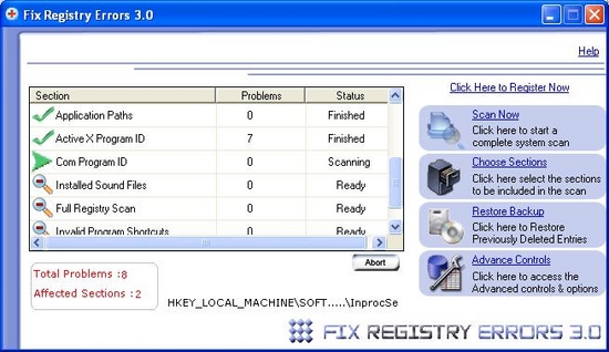 With Fix Registry Errors you can safely clean and repair Windows registry problems with a few simple mouse clicks! Problems with the Windows registry are a common cause of Windows crashes and error messages. By using Fix Registry Errors regularly and fixing your registry, your system will not only be more stable but will also help Windows and your software run faster. Fix Registry Errors uses a high-performance detection algorithm to quickly identify missing and invalid references in your Windows registry. These problems can occur for many reasons including being left- behind after the un-installation or incorrect removal of software, by missing or corrupt hardware drivers, or orphaned startup programs. Fix Registry Errors will scan your PC Absolutely FREE and let you know if your PC has any errors that could affect it's performance or make it crash! Download it now and get a free hard drive scan! Free Trial verison.