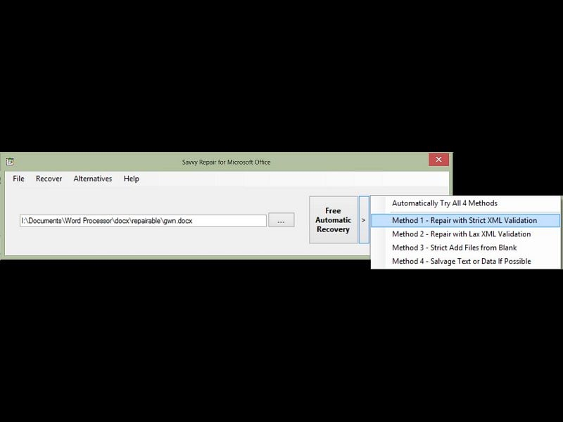 Savvy Repair for Microsoft Office tries four methods of repair of corrupt of Word DOCX, Excel XLSX and PowerPoint PPTX files. DOCX, XLSX and PPTX files are collections of mostly XML sub-files. All four methods first try to repair the zip structure. The first 3 methods involve attempts to repair all the xml sub-files. The repair is done by finding the first XML error, truncating the file there and then using xmllint to add the right tags to the end of the now shorter file.
