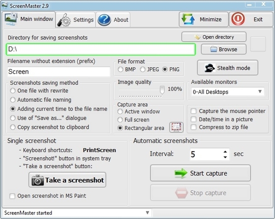 Easy program for automatic screenshot capture allowing making screenshots with set frequency. Option of fast screen capture with screenshot saving to specified folder. The program can work in hidden screen capture mode without displaying in task bar and tray. Screenshots are saved to local or network folder in JPG, BMP, PNG format or copied to clipboard. The program can be easily set up and has a user-friendly interface.