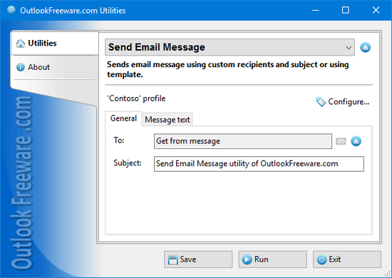 Free tool to send Outlook email message using the specified account, sender's address, recipient lists, subject, message text, and file attachments. In addition, you can specify a, ...